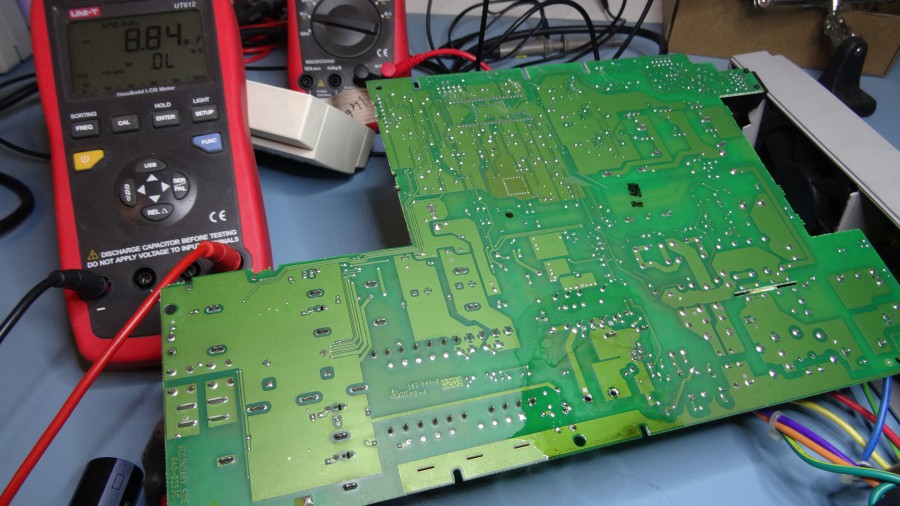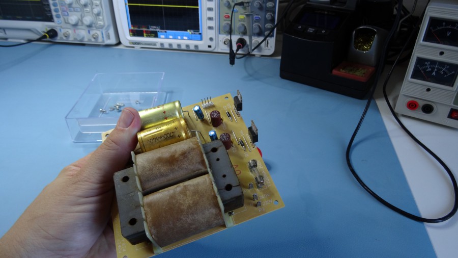 Oprava průmyslového napájecího zdroje pro CCTV. Výměna kondenzátorů a oprava zpětnovazební reference napětí, testování